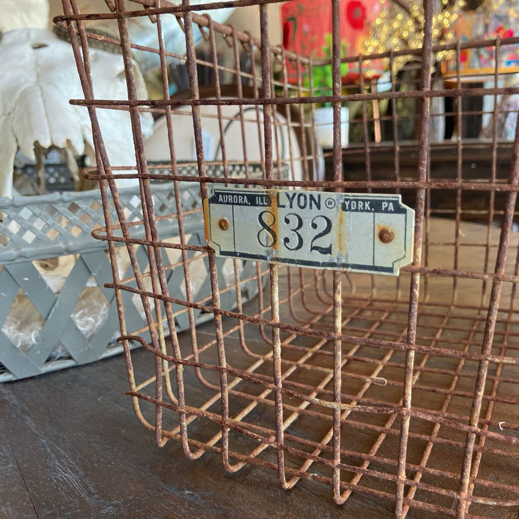 Vintage rusty metal locker basket previously used by a school. Can be used for a rustic statement in a room, storage, or to hold plants on your paio! We have a collection of these and the one you get may be slightly different than pictured. However the measurements and design are the same. Measures 13" X 9" X 8"
