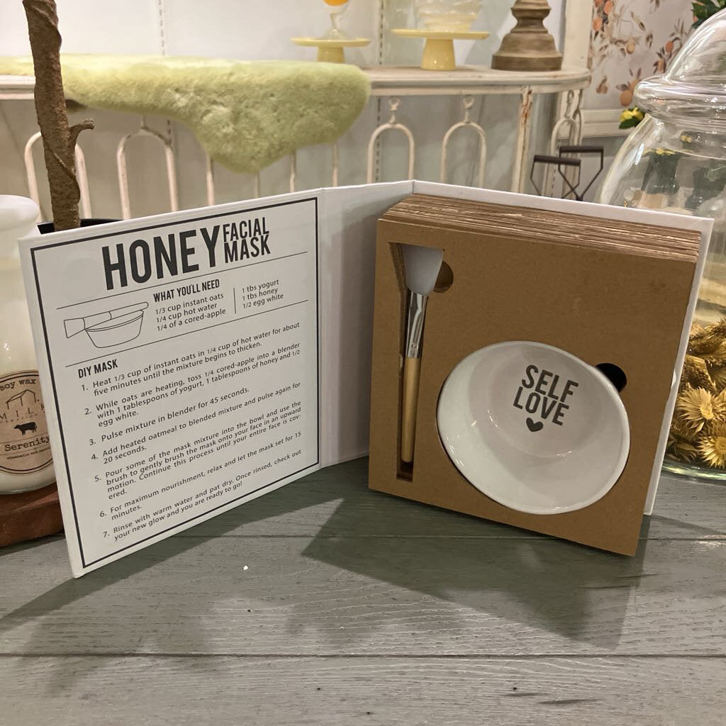 Spa Day DIY mask essentials kit comes with a mixing bowl and spatula. A honey facial mask recipe is included inside.